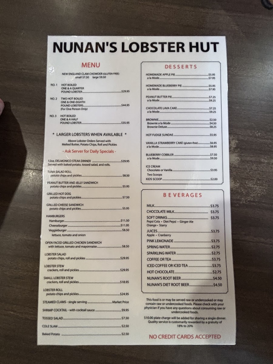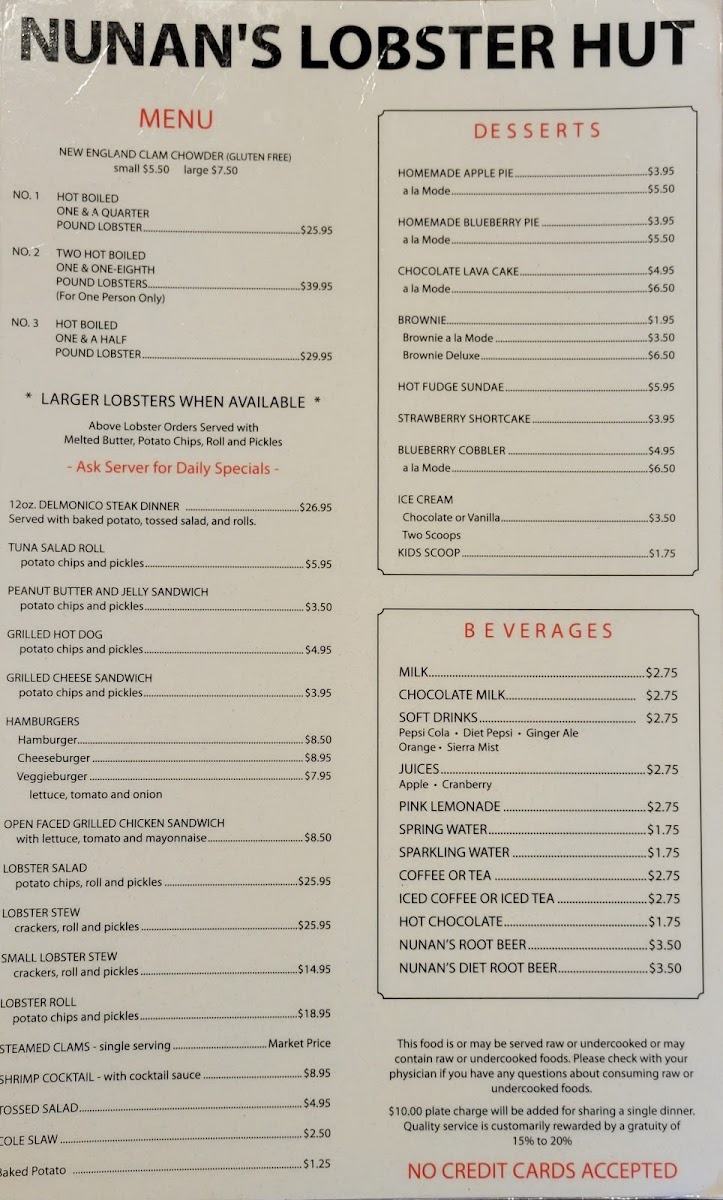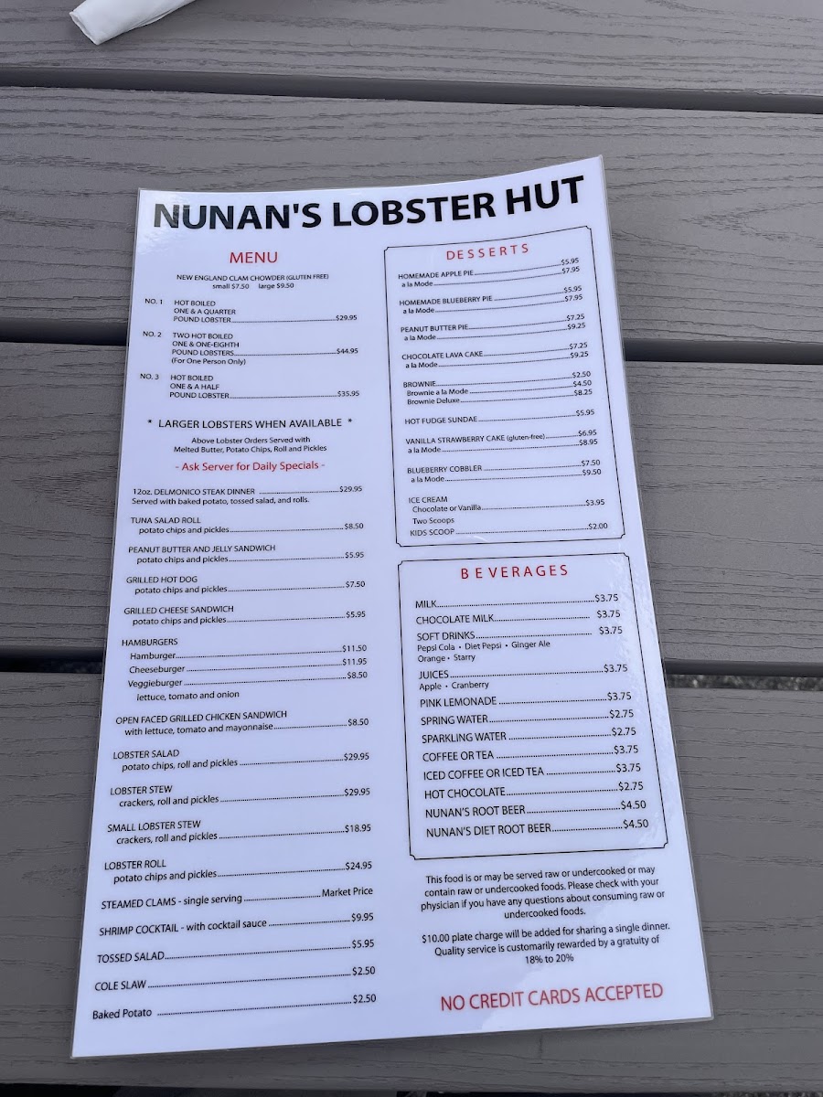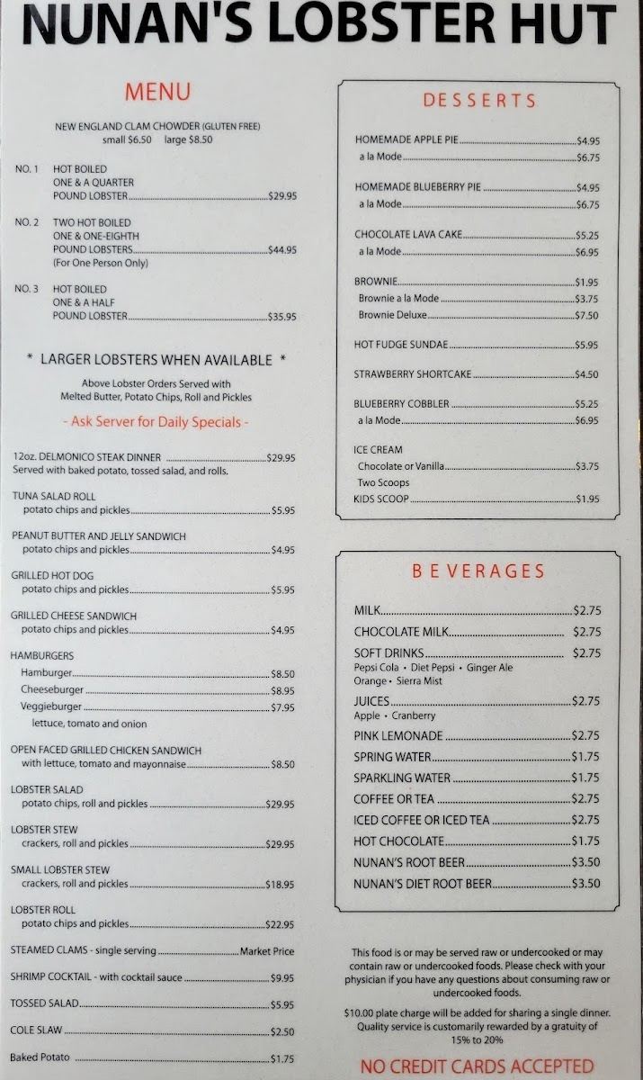 If you're craving the freshest seafood, look no further than the Nunan's Lobster Hut Menu. Nestled in the charming town of Kennebunkport, ME, this cozy spot offers a true taste of New England with its selection of lobster dishes, clam chowder, and other seafood favorites. Whether you're in the mood for a classic lobster roll, succulent fried clams, or a hearty bowl of clam chowder, there's something here to satisfy every seafood lover's appetite. Each dish is prepared with care, highlighting the vibrant flavors of Maine's coastal bounty. Perfect for a relaxed lunch or a casual dinner, Nunan's Lobster Hut provides a welcoming atmosphere to enjoy delicious meals that truly capture the essence of the region.